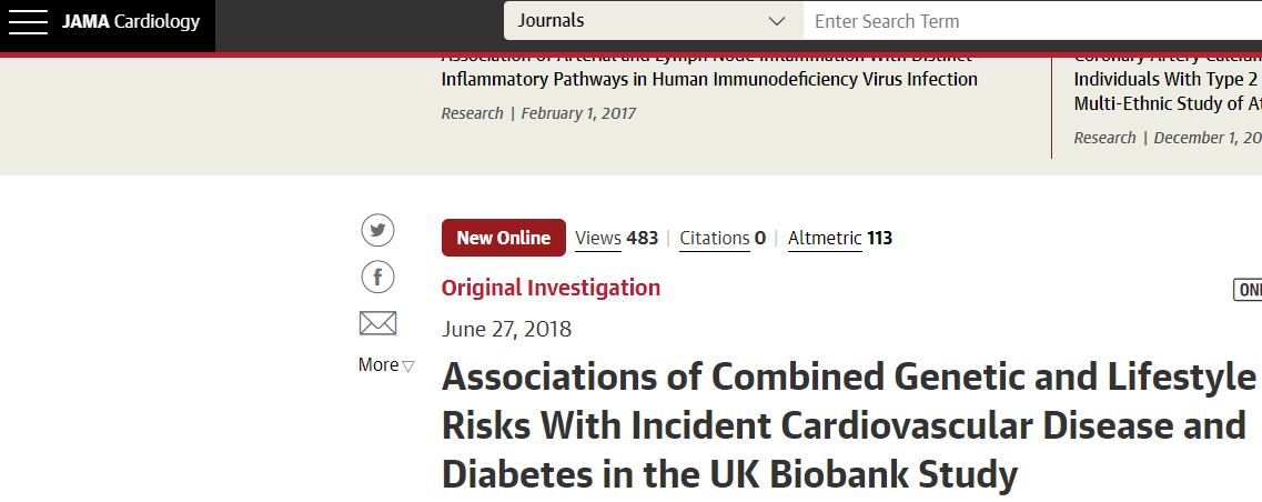 這一成果于6月27日以“Associations of Combined Genetic and Lifestyle Risks With Incident Cardiovascular Disease and Diabetes in the UK Biobank Study”為題發(fā)表在JAMA Cardiology雜志上。研究主要作者Pim van der Harst說(shuō):“我們知道基因在心血管風(fēng)險(xiǎn)中扮演角色,也知道生活方式影響心血管健康,但我們不知道這兩者是如何相互影響的。”